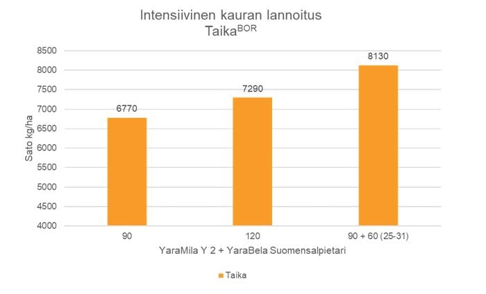 Lannoittamalla kauran kahdessa osassa, keväällä YaraMila Y 2:lla 333 kg/ha (90 kg N/ha) ja lisälannoitus YaraBela Suomensalpietarilla 222 kg/ha (60 kg N/ha), saatiin 1360 kilon sadonlisä. Syyskuun 2019 kauran ja lannoitteen hinnoilla laskien lisätuottoa tuli 129 euroa hehtaarille.