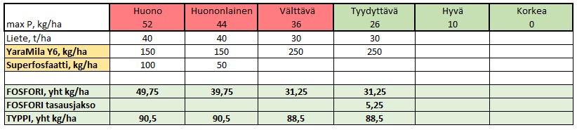 Hyväsatoisten säilörehunurmien fosforitaseet ovat satovuosina negatiivisia ympäristökorvauksen fosforilannoituksen enimmäismääriä käytettäessä. Siksi satovuosien fosforilannoituksen lisäksi nurmien perustamisvaiheen fosforilannoitukseen tulee kiinnittää huomiota.