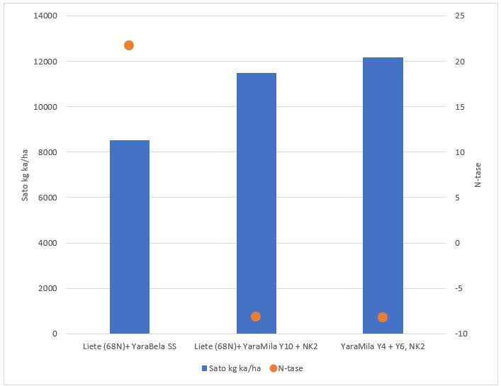Kun pelkkä typpilannoitus YaraBela-lannoitteella vaihdettiin Hankkijan kasvuohjelman kokeessa Siikajoella YaraMila-lannoitteeksi, parani typenkäytön tehokkuus. Tasapainoisella lannoituksella pystyttiin lannoitetypestä hyödyntämään noin 30 kg N/ha enemmän! Myös nurmisato oli melkein 3t/ha suurempi.