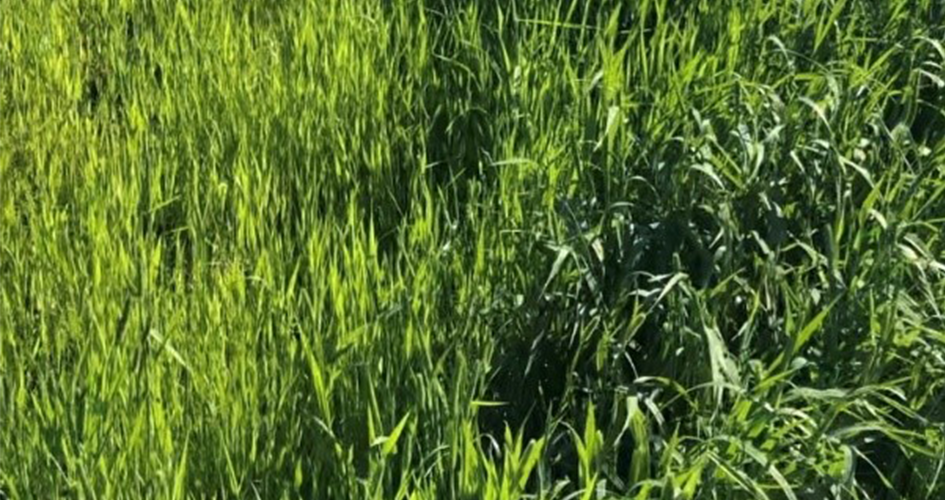Nollaruutu eli lannoittamaton ruutu vasemmalla osoittaa kuinka paljon ravinteita vapautuu maasta nurmien käyttöön. Oikealla puolella peruslannoitusruutu (100 kg N). Kuva Kotkaniemestä.