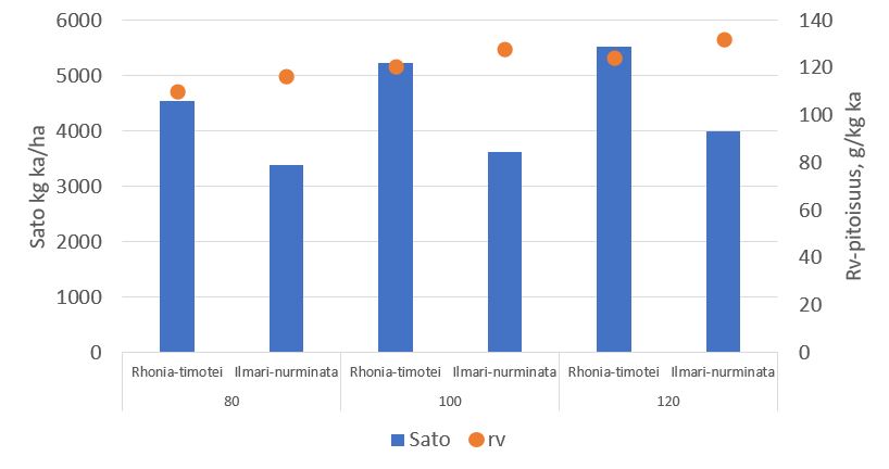 Jos nurmen päälajina on säilynyt timotei ja seoksen timoteilajikkeena on nopeakasvuinen, kolmen niiton timoteilajike kuten Rhonia, tulee ensimmäisen sadon riittävään lannoitukseen kiinnittää erityistä huomiota. Yara Kotkaniemen kolmivuotisessa kokeessa tutkittiin eri typpilannoitustasojen vaikutusta ensimmäisen nurmisadon määrään ja laatuun (Kuva 1).