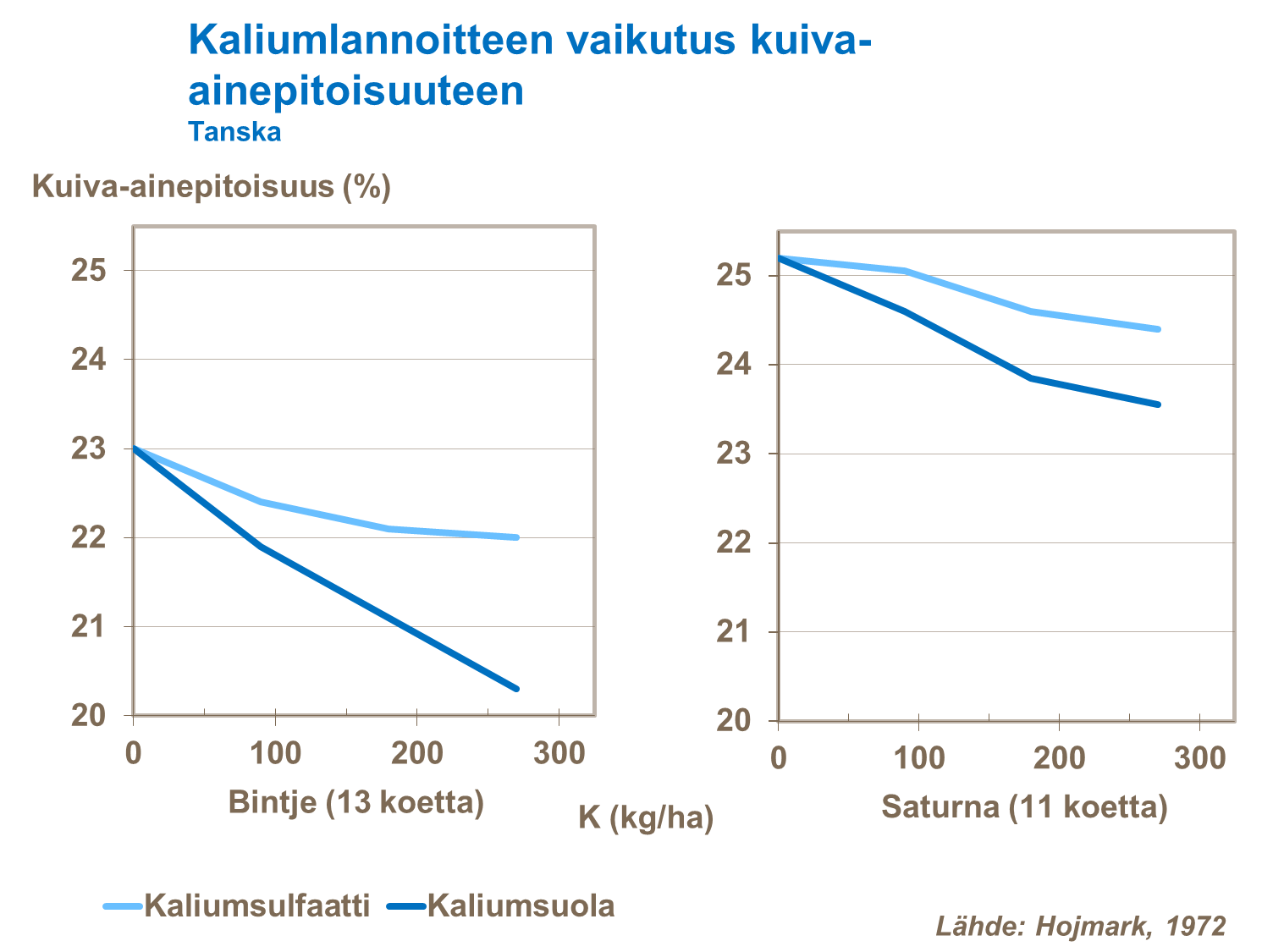 Perunan lannoituksessa käytetään aina kaliumsulfaattia, sillä kaliumsuolan sisältämä kloori laskee mukulan kuiva-ainepitoisuutta. Kaliumsulfaatin käyttö parantaa kuiva-ainepitoisuutta merkittävästi.
