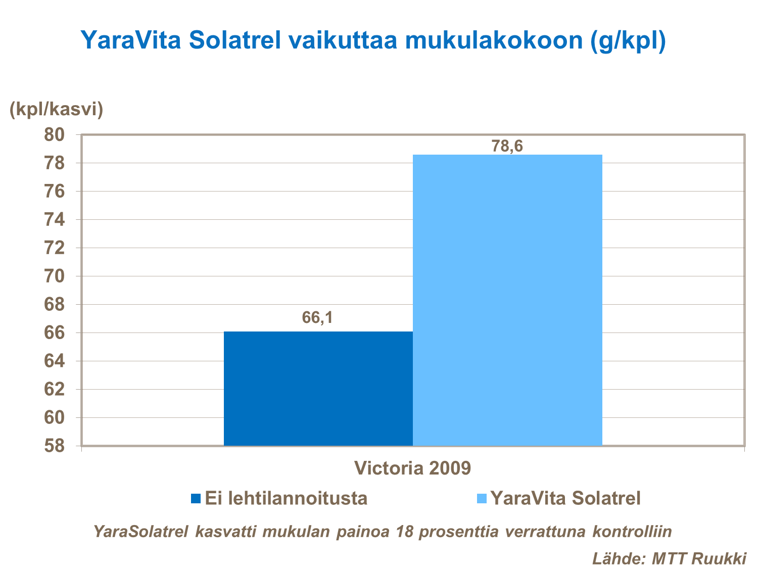 Fosforia sisältävä YaraVita Solatrel -lehtilannoitus lisää mukulakokoa myöhästetyssä käsittelyssä.