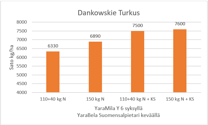 Lähde: Yara Kotkaniemi, Kasvuohjelma. Dankowskie Turkus tuotti 940 kg/ha paremman sadon, kun kasvinsuojelulla torjuttiin lakoontuminen ja kasvitaudit. Kasvustoon käytettiin Moddus EVO -korrensäädettä 0,25 l/ha (BBCH 25) ja Elatus Era -tautiainetta 0,6 l/ha (BBCH 39).