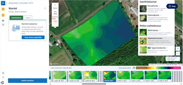Tulevalla kasvukaudella on Atfarm-satelliittipalvelussa nurmiviljelijöiden käytössä uusi ominaisuus – nurmen satoarviotyökalun beta-versio. Satoarviotyökalun avulla voit verrata nurmilohkojen satoisuutta reaaliaikaisesti tai tarkastella aiempien vuosien satoarvioita. Lue lisää Nurmen satoarviotyökalu | Yara Suomi.