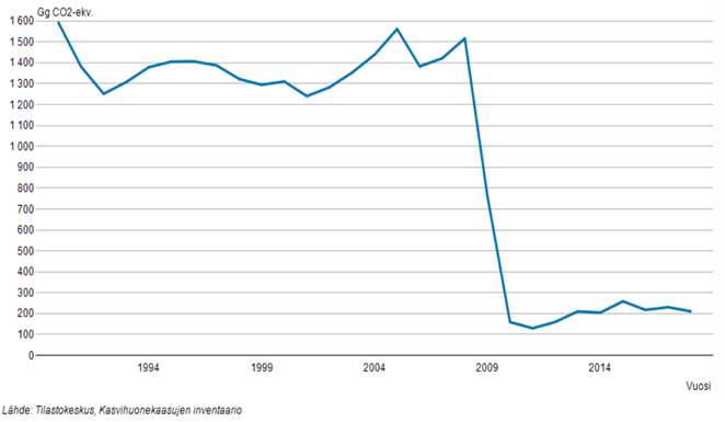 Typpihapon tuotannon N2O-päästöjen kehitys Suomessa vuosina 1990–2018.