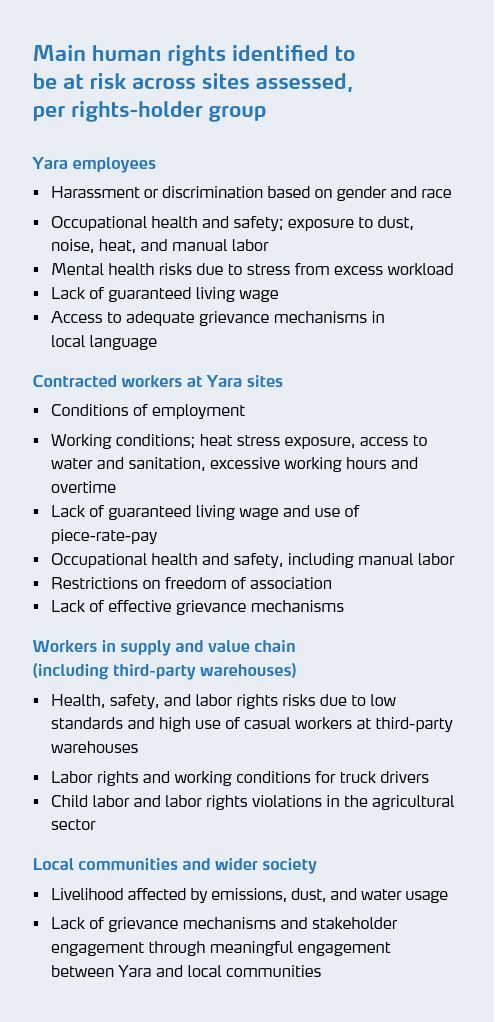Yara’s use of contracted labor is a core driver of salient human rights risks for workers at Yara’s sites, as well as in our supply chain, covering, for instance, third-party-run warehouses and logistics providers. Yara’s ability to secure individual workers’ labor rights, including fair wages, working hours, benefits, annual leave, work predictability, and a safe and healthy workplace free from discrimination is reduced when using contracted labor. Performing heavy manual labor is an additional health and safety risk when combined with high temperatures and humidity.